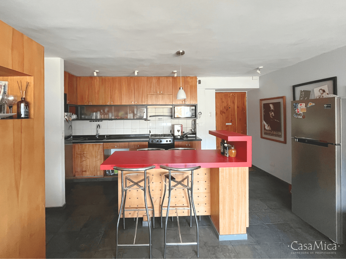 – Cocina integrada al living-comedor, con mesón para comedor de diario